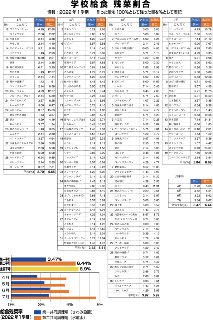 学校給食の残菜率は全国平均で約6.9%(※)というデータから、第二はこれとほぼ同等なので、第一の残菜率の低さがよくわかります。