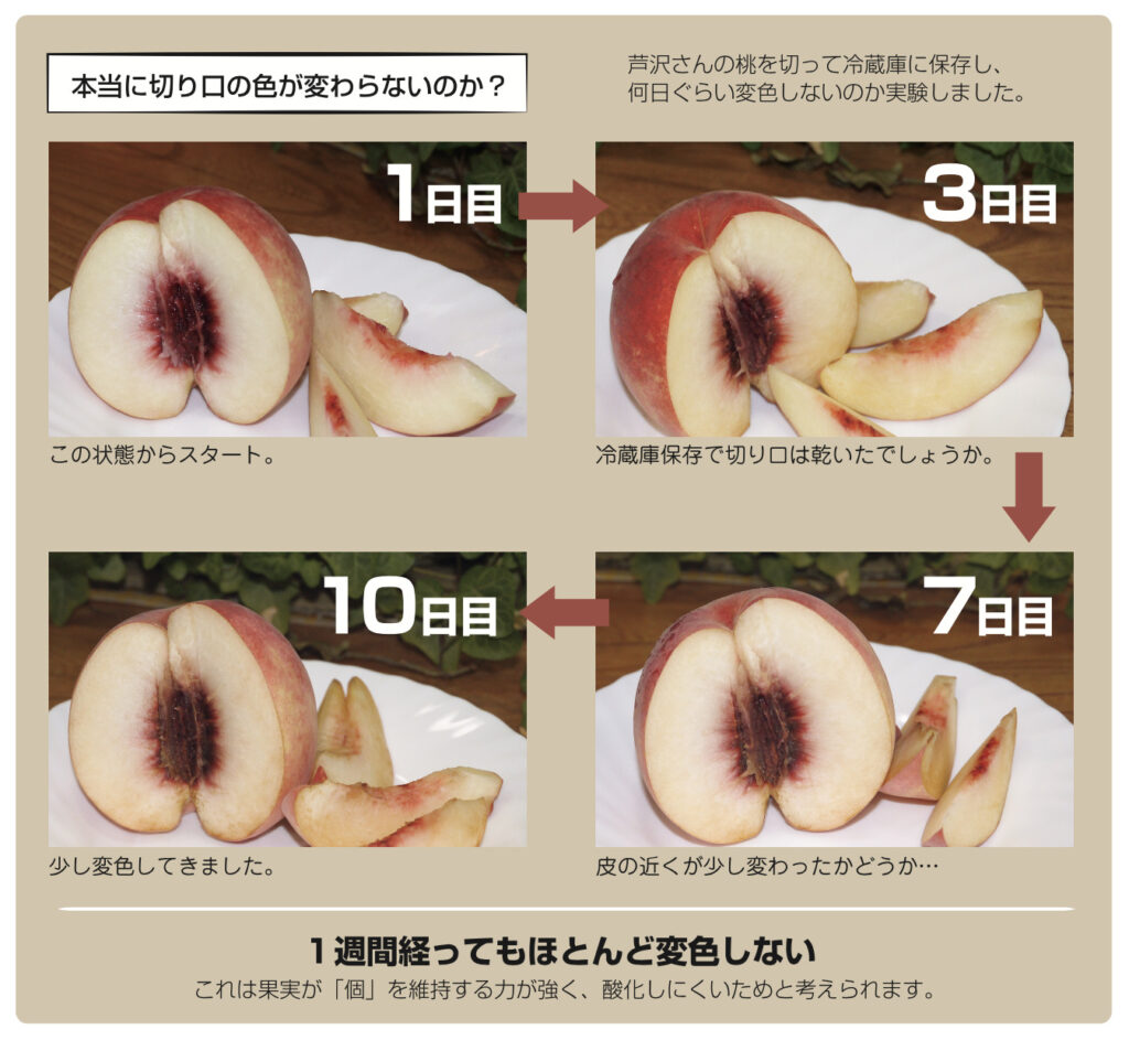 しかし、それ以上に、彼は、「桃で法を説く」。桃の時期、芦沢代表の元を訪れた客は、当然のように桃でもてなされる。もちろん、皮ごと食べられるぐらい美味しい。しかし、それだけではない。何時間か経って帰るとき客は気付き、驚く。ナイフを入れたまま置いてあった桃の切り口がまったく変色していない。最初に切ったときと同じみずみずしさをまだ保っている。その桃こそが、長年、生体エネルギー技術を学び実践し続けた彼の成果であり、証でもある。何も喋らない桃が、最も雄弁に芦沢ーを語っている。